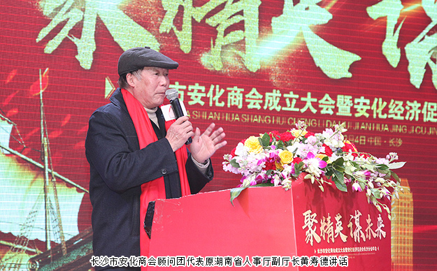 隨后,原湖南省人事廳副廳長黃壽德作為長沙市安化商會顧問團代表講話。他首先對長沙市安化商會的成立致以誠摯的祝賀。他表示,長沙歷史悠久,人杰地靈,眾多優(yōu)秀的安化籍企業(yè)家在這片土地上辛勤創(chuàng)業(yè),把長沙當(dāng)成實現(xiàn)人生價值的大舞臺,不僅自己成就了事業(yè),也為兩地經(jīng)濟社會發(fā)展作出了應(yīng)有的貢獻。他希望,長沙市安化商會能夠成為安化籍在長人士交流溝通、互幫互助、共同提升的平臺,為長沙和安化的經(jīng)濟文化交流以及兩地經(jīng)濟的互相促進、共同發(fā)展做出更大的貢獻。長沙市民政局黨委副書記、副局長伍仁華在講話中表示,長沙市民政局將一如既往為商會提供優(yōu)質(zhì)的服務(wù),希望廣大安化籍企業(yè)家要繼續(xù)發(fā)揚“致富思源、義利兼顧、戀祖愛鄉(xiāng)、回饋桑梓”的湘商精神,在國家“一帶一路”及湖南“創(chuàng)新引領(lǐng)、開放崛起”戰(zhàn)略的實踐中積極做貢獻,做合法經(jīng)營、誠信經(jīng)營的表率,為湖南的發(fā)展助力,為安化人民爭光。