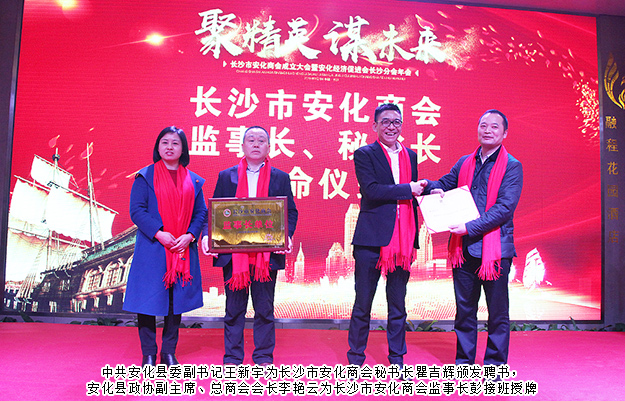 為了更好的加強安化籍企業(yè)家,鄉(xiāng)賢的相互聯(lián)系,更好的整合資源,打造溝通交流的平臺,實現(xiàn)合作共贏,進一步提升安化的影響力,增強安化人的影響力和凝聚力,安化商會應(yīng)運而生。湖南省政協(xié)常委、長沙市政協(xié)副主席、長沙市工商聯(lián)主席彭繼球宣讀商會選舉結(jié)果。綠之韻集團董事長胡國安當(dāng)選長沙市安化商會會長,夏曉輝當(dāng)選執(zhí)行會長,龍勝全、吳余生、夏義良、諶獻軍等當(dāng)選副會長。與會領(lǐng)導(dǎo)為新當(dāng)選的會長、執(zhí)行會長、監(jiān)事長授牌。同時,為了表彰為安化發(fā)展做出貢獻的杰出代表,大會授予盧虎行等八位安化籍代表“特殊貢獻獎”,安化經(jīng)濟促進會長沙分會理事長李蒲初先生為獲獎代表頒獎。