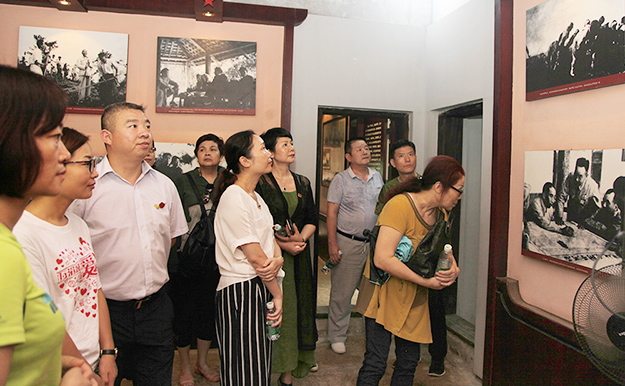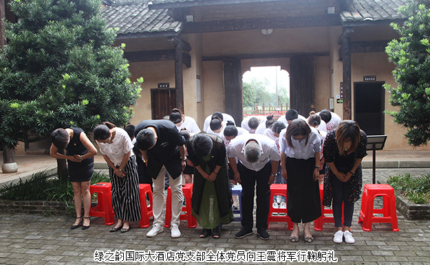 朗誦完畢后,綠之韻國(guó)際大酒店支部全體黨員有序進(jìn)入王震同志故居參觀?!盀閲?guó)開(kāi)基,將軍百戰(zhàn)彪青史;畢生革命,桑梓千秋仰大名?!边@一幅掛在故居門前的對(duì)聯(lián)是對(duì)王震將軍波瀾壯闊的一生的最好詮釋。大家滿懷敬畏和感恩,聆聽(tīng)著講解員描述王震同志生前為革命事業(yè)和黨的事業(yè)奮勇拼搏的光榮事跡,細(xì)致生動(dòng)的解說(shuō)將眾人帶到了戰(zhàn)火紛飛的革命歲月,帶到了新中國(guó)建設(shè)初期的火紅年代。