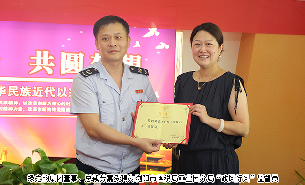 為了切實(shí)有效的加強(qiáng)政風(fēng)行風(fēng)建設(shè),提高依法治稅和為民服務(wù)的水平,瀏陽市國稅局工業(yè)園分局特聘綠之韻集團(tuán)董事、總裁勞嘉為“政風(fēng)行風(fēng)”監(jiān)督員,并由卜輝局長為勞嘉總裁頒發(fā)特聘證書。卜輝局長對勞嘉總裁表示祝賀并希望:關(guān)心國稅改革與發(fā)展,關(guān)注干部勤政與清廉,當(dāng)好稅風(fēng)監(jiān)督員、稅收宣傳員、稅情聯(lián)絡(luò)員,共同為國稅現(xiàn)代化事業(yè)保駕護(hù)航。