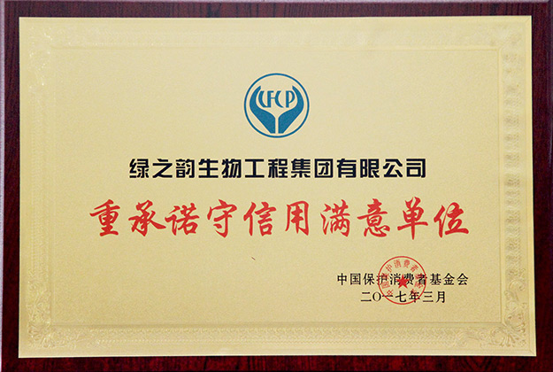 中國(guó)保護(hù)消費(fèi)者基金會(huì)根據(jù)《消費(fèi)者權(quán)益保護(hù)法》所賦予的職能和職責(zé),以保護(hù)消費(fèi)者合法權(quán)益、提高消費(fèi)者地位、推進(jìn)保護(hù)消費(fèi)者事業(yè)的發(fā)展為宗旨,在全國(guó)范圍內(nèi)開展保護(hù)消費(fèi)者權(quán)益相關(guān)工作。綠之韻集團(tuán)認(rèn)真貫徹執(zhí)行《消費(fèi)者權(quán)益保護(hù)法》《產(chǎn)品質(zhì)量法》《廣告法》及其他相關(guān)法律法規(guī),嚴(yán)格按照國(guó)家的行業(yè)規(guī)定與質(zhì)量標(biāo)準(zhǔn)組織生產(chǎn),積極接受政府各職能部門、消費(fèi)者組織和廣大消費(fèi)者監(jiān)督,經(jīng)過(guò)中國(guó)保護(hù)消費(fèi)者基金會(huì)及活動(dòng)評(píng)審組的層層評(píng)審,被光榮授予“重承諾守信用滿意單位”稱號(hào)。