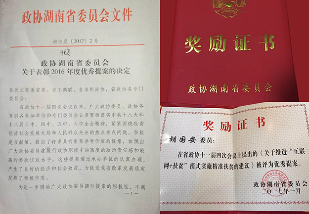 會議聽取了湖南省政協(xié)副主席賴明勇代表十一屆省政協(xié)常委會所作的關(guān)于十一屆四次會議以來提案工作情況的報告。會議還表彰了112名優(yōu)秀政協(xié)委員和41件優(yōu)秀提案,胡國安委員《關(guān)于推進“互聯(lián)網(wǎng)+扶貧”模式,實施精準扶貧的建議》被政協(xié)湖南省委員會授予“優(yōu)秀提案”,湖南省政協(xié)副主席楊維剛宣讀了表彰決定。