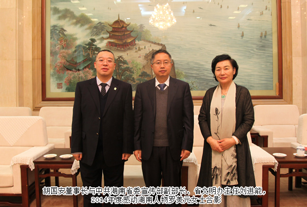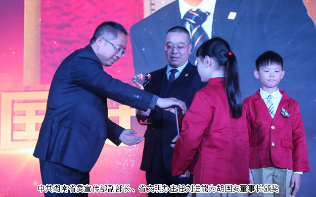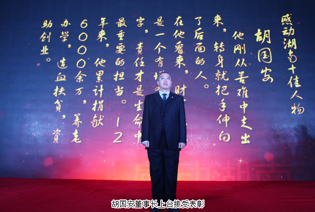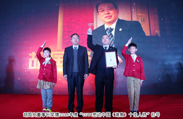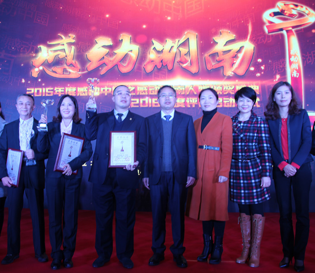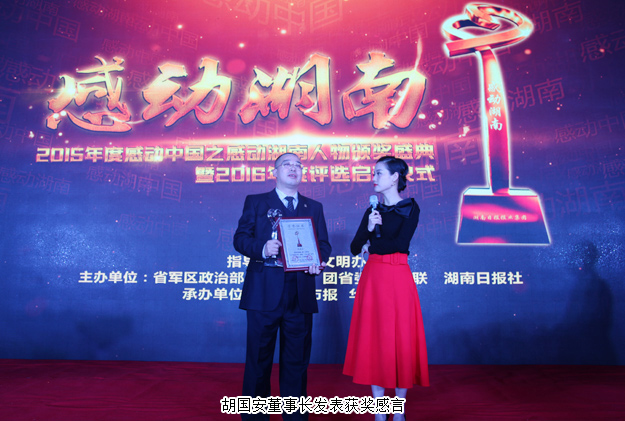 感動(dòng)中國,感動(dòng)湖南。2016年11月9日,由湖南省文明辦指導(dǎo),湖南日?qǐng)?bào)社、省總工會(huì)、省軍區(qū)政治部、團(tuán)省委、省婦聯(lián)共同主辦,三湘都市報(bào)、華聲在線承辦的“2015年度感動(dòng)中國之感動(dòng)湖南人物”頒獎(jiǎng)典禮在湖南省委九所賓館隆重舉行。湖南省人大常委會(huì)副主任李友志,省人大常委會(huì)委員、教科文衛(wèi)委員會(huì)主任委員梁爾源,中共湖南省委宣傳部副部長、省文明辦主任劉進(jìn)能,省總工會(huì)黨組成員、副主席黃新民,省婦聯(lián)黨組成員、副主席魯華,湖南日?qǐng)?bào)社黨組成員、副總編輯鄧獻(xiàn)忠,省軍區(qū)轉(zhuǎn)業(yè)辦主任吳湘波,省委宣傳部新聞處處長馮錦,省文明辦創(chuàng)建處處長張志輝,湖南日?qǐng)?bào)社編委、三湘都市報(bào)總編輯、華聲在線常務(wù)副總裁張?jiān)茐?mèng),省總工會(huì)宣教部副部長羅偉,共青團(tuán)湖南省委宣傳部部長陳麗等出席活動(dòng)。綠之韻集團(tuán)董事長胡國安獲評(píng)2015年度“CCTV感動(dòng)中國(湖南)十佳人物”稱號(hào),中共湖南省委宣傳部副部長、省文明辦主任劉進(jìn)能為胡國安董事長頒獎(jiǎng)。