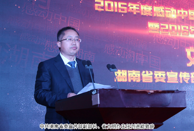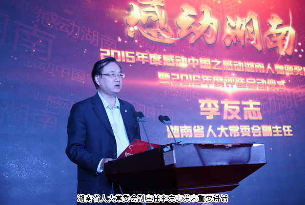 會(huì)上,中共湖南省委宣傳部副部長、省文明辦主任劉進(jìn)能為活動(dòng)致辭。湖南省人大常委會(huì)副主任李友志發(fā)表重要講話,他在講話中指出:通過“感動(dòng)湖南”活動(dòng)的開展,希望在全社會(huì)營造一種助人為樂、積極向上的良好氛圍,激蕩起人們向上、向善的信心和勇氣。無論是今天站在舞臺(tái)上的2015年度“感動(dòng)湖南人物”,還是評(píng)選入圍2016年度的“感動(dòng)湖南”人物代表,他們無不向全社會(huì)展示了敢為人先、無私大愛的湖南風(fēng)骨。我們要向這些善行好人、行業(yè)榜樣致敬!