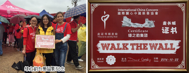“走長(zhǎng)城”公益活動(dòng)是國(guó)際關(guān)心中國(guó)慈善協(xié)會(huì)(簡(jiǎn)稱ICC)創(chuàng)始人英國(guó)義工高永恩先生從2007年發(fā)起的,每年的金秋在加拿大、澳大利亞、英國(guó)、美國(guó)、新加坡、法國(guó)、愛爾蘭、荷蘭、中國(guó)香港、長(zhǎng)沙、衡陽(yáng)、三門峽的愛心義工們攜手為孤殘兒童行走。通過(guò)活動(dòng)籌集善款幫助有需要的孤殘兒童,讓孩子們有新的家,有愛、希望和機(jī)會(huì)。自2014年初,綠之韻集團(tuán)與ICC和孩子們結(jié)緣,胡國(guó)安董事長(zhǎng)、勞嘉執(zhí)行總裁每年多次帶隊(duì)看望孩子們,并捐贈(zèng)善款用于ICC湖南的孤殘兒童合作項(xiàng)目。