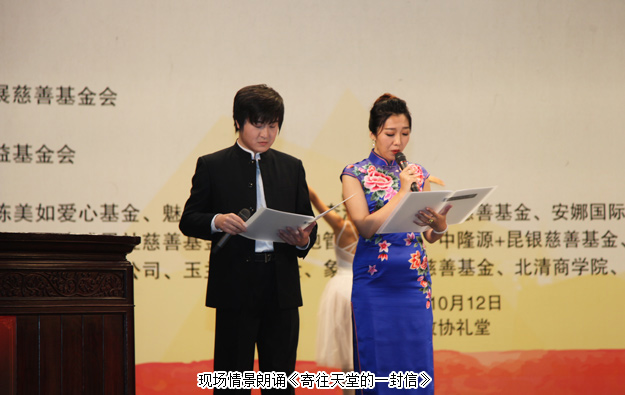 晚會(huì)現(xiàn)場情景朗誦《寄往天堂的一封信》讓現(xiàn)場觀眾凄然淚下。故事是根據(jù)吉林省貧困母親于桂華女士和女兒得大病至到女兒病逝的真實(shí)事件,在北京求助過程中得到了“關(guān)愛貧困母親”項(xiàng)目的大力幫助。于桂華來的現(xiàn)場,她說目前最大的愿望就是回報(bào)社會(huì),感恩幫助過的好心人。