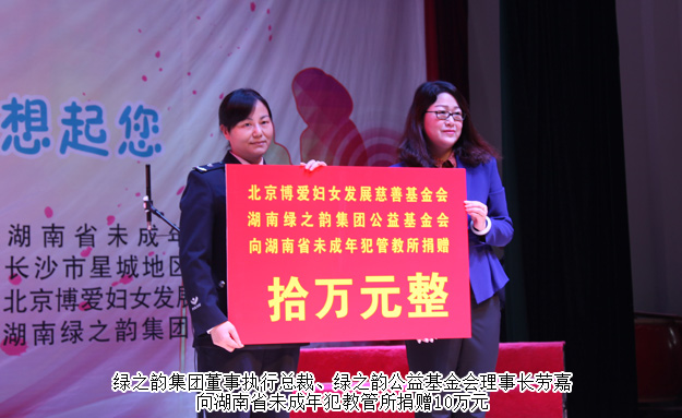 活動(dòng)現(xiàn)場,湖南省司法廳黨組成員、副廳長、省監(jiān)獄管理局黨委書記、局長方華堂講話,他感謝來自社會(huì)各界的無私大愛,不但能解決服刑人員及其家里的實(shí)際困難,溫暖、感動(dòng)日夜盼望他們回家的親人的心,更能使服刑人員懂得了愛,更學(xué)會(huì)了感恩,讓他們充滿信心和希望,迎接未來的生活。綠之韻集團(tuán)董事執(zhí)行總裁、綠之韻公益基金會(huì)理事長勞嘉向湖南省未成年犯教管所捐贈(zèng)10萬元,并表示,每個(gè)青少年都是實(shí)現(xiàn)中國夢(mèng)的強(qiáng)大青春能量,每個(gè)人都可以跌倒再爬起,只要孩子們努力學(xué)習(xí)改造,掌握技能本領(lǐng),就一定能重回正途、重塑人生,迎來嶄新、美好的明天。