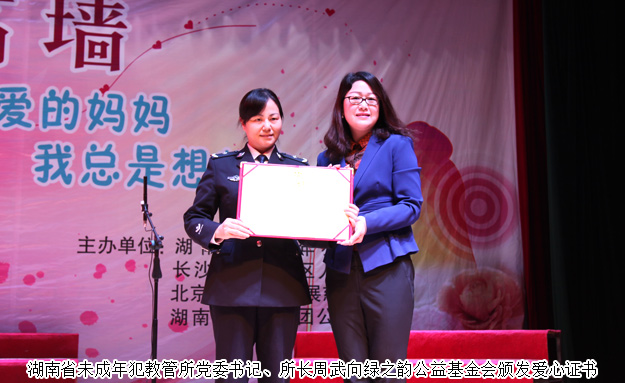 2016年5月8日,情暖高墻——綠之韻集團(tuán)關(guān)愛未成年服刑人員及特困母親慰問愛心活動(dòng)聯(lián)合北京博愛婦女發(fā)展慈善基金會(huì)走進(jìn)湖南省未成年犯教管所。湖南省司法廳黨組成員、副廳長、省監(jiān)獄管理局黨委書記、局長方華堂,中紀(jì)委辦公廳原巡視員、慈善基金會(huì)顧問毛祚策,北京博愛婦女發(fā)展慈善基金會(huì)會(huì)長陳富剛以及湖南省未成年犯教管所領(lǐng)導(dǎo)等出席活動(dòng)。綠之韻集團(tuán)董事執(zhí)行總裁、綠之韻公益基金會(huì)理事長勞嘉,綠之韻集團(tuán)黨總支書記劉云、綠之韻公益基金會(huì)秘書長蔣文、湖南分公司副經(jīng)理劉磊等共同參與活動(dòng)。
