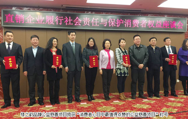 2016年3.15前夕,由中國消費者報社、中國消費網(wǎng)主辦的3·15直銷企業(yè)履行社會責(zé)任與保護消費者權(quán)益座談會在北京召開。國家工商總局競爭執(zhí)法局副局長白京華、國家工商總局消費者權(quán)益保護局副局長黃建華、國家工商總局反壟斷與反不正當競爭執(zhí)法局直銷監(jiān)管處處長張衛(wèi)明、商務(wù)部市場秩序司法規(guī)處處長吳鳳武、中國消費者協(xié)會副會長兼秘書長常宇、《中國消費者報》社長朱劍橋,以及省市工商和市場監(jiān)管部門相關(guān)業(yè)務(wù)負責(zé)人出席了本次座談會。綠之韻集團董事執(zhí)行總裁勞嘉應(yīng)邀出席會議,并擔任會議小組討論主持人。綠之韻集團“關(guān)愛貧困母親救助項目”和“樹人行動公益慈善項目”攬獲“消費者心目中最值得點贊的優(yōu)秀公益慈善項目"榮譽稱號。