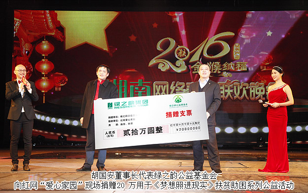 “國家把這么大一片山林交給我來守護(hù),這是我的責(zé)任,也是我的榮幸。”從18歲到56歲,森林瞭望員余錦柱在江華瑤族自治縣尖子嶺堅(jiān)守了38年,準(zhǔn)確報(bào)告火警近300次,為國家挽回直接經(jīng)濟(jì)損失3000多萬元。他說他最大的夢想除了保護(hù)好森林不被破壞之外,還希望能夠帶著家人去國外走走看看,綠之韻集團(tuán)董事長胡國安被余錦柱的精神和夢想感動,晚會現(xiàn)場,特意為他送上了由綠之韻公益基金會提供的一萬元夢想基金,希望可以幫助他圓夢。除此之外,胡國安董事長代表綠之韻公益基金會向紅網(wǎng)“愛心家園”現(xiàn)場捐贈20 萬用于《夢想照進(jìn)現(xiàn)實(shí)》扶貧助困系列公益活動,他表示:從綠之韻集團(tuán)成立開始,就堅(jiān)持生產(chǎn)綠色產(chǎn)品,晚會凸顯的“綠色、生態(tài)”主題,與綠之韻集團(tuán)“綠色發(fā)展、生態(tài)文明”建設(shè)、“互聯(lián)網(wǎng)+三農(nóng)產(chǎn)業(yè)”、“互聯(lián)網(wǎng)+公益”戰(zhàn)略完美契合,相得益彰!讓山川林木蔥郁,讓大地遍染綠色,讓天空湛藍(lán)清新……這是建設(shè)美麗中國的美好藍(lán)圖。綠之韻集團(tuán)必將綠色環(huán)保理念傳遍祖國大地。