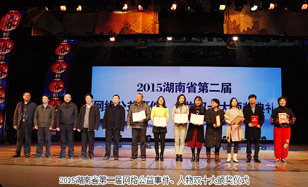 晚會現(xiàn)場還舉行了2015湖南省第二屆網(wǎng)絡(luò)公益事件、人物雙十大頒獎儀式。2015年,綠之韻集團(tuán)攜手湖南經(jīng)視聯(lián)合開展的《夢想照進(jìn)現(xiàn)實(shí)》一對一幫扶活動,幫助了幾十名貧困家庭的學(xué)子、老人,助力他們實(shí)現(xiàn)夢想,得到了社會的廣泛好評。綠之韻集團(tuán)《夢想照進(jìn)現(xiàn)實(shí)》公益項(xiàng)目也因此獲得2015湖南省第二屆網(wǎng)絡(luò)十大公益事件,綠之韻公益基金會秘書長蔣文上臺領(lǐng)獎。