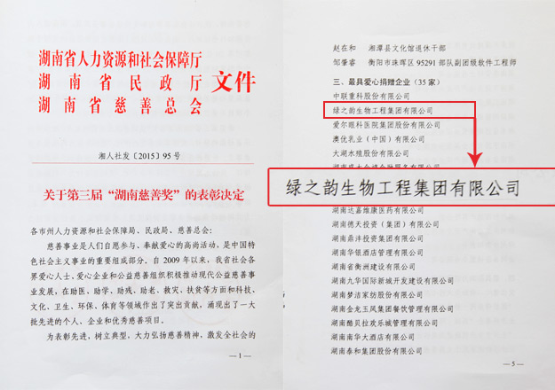 “凝聚小家、發(fā)展大家、報(bào)效國(guó)家”是綠之韻的經(jīng)營(yíng)哲學(xué)。十二年來(lái),綠之韻集團(tuán)在胡國(guó)安董事長(zhǎng)帶領(lǐng)下,踴躍參與和傾情捐助了教育、關(guān)愛(ài)老人、賑災(zāi)、扶貧、幫困等100多項(xiàng)社會(huì)慈善事業(yè),累計(jì)捐贈(zèng)款物達(dá)6000多萬(wàn)元,用實(shí)際行動(dòng)履行著企業(yè)應(yīng)盡的責(zé)任和義務(wù),如:在全國(guó)各地先后援建了11所希望小學(xué)、陸續(xù)投入1000萬(wàn)元開(kāi)展“樹(shù)人行動(dòng)”、投入300萬(wàn)元在全國(guó)各地開(kāi)展“綠韻圓夢(mèng)?書(shū)香助學(xué)”活動(dòng)、向湖南省光彩事業(yè)基金捐贈(zèng)3000萬(wàn)元促進(jìn)“老、少、邊、窮”地區(qū)的經(jīng)濟(jì)發(fā)展和社會(huì)進(jìn)步、捐資300萬(wàn)專(zhuān)項(xiàng)扶貧基金開(kāi)展“關(guān)愛(ài)貧困母親”行動(dòng)。產(chǎn)業(yè)富民、服務(wù)“三農(nóng)”,綠之韻湖南安化萬(wàn)畝中藥材種植基地是省委、省政府“萬(wàn)企聯(lián)村?共同發(fā)展”30個(gè)省級(jí)重點(diǎn)示范項(xiàng)目之一,帶動(dòng)了10萬(wàn)農(nóng)民脫貧致富,40萬(wàn)受益農(nóng)民不需外出務(wù)工,實(shí)現(xiàn)就地轉(zhuǎn)化就業(yè),促進(jìn)了當(dāng)?shù)亟?jīng)濟(jì)發(fā)展和社會(huì)和諧,贏(yíng)得了各級(jí)政府、社會(huì)各界人士的廣泛好評(píng)。2015年,綠之韻慈善基金經(jīng)過(guò)湖南省民政廳批準(zhǔn)正式升級(jí)為綠之韻公益基金會(huì),為多方籌募慈善款物,有效實(shí)施慈善救助,為推進(jìn)湖南省公益慈善事業(yè)快速發(fā)展做出了積極貢獻(xiàn)。