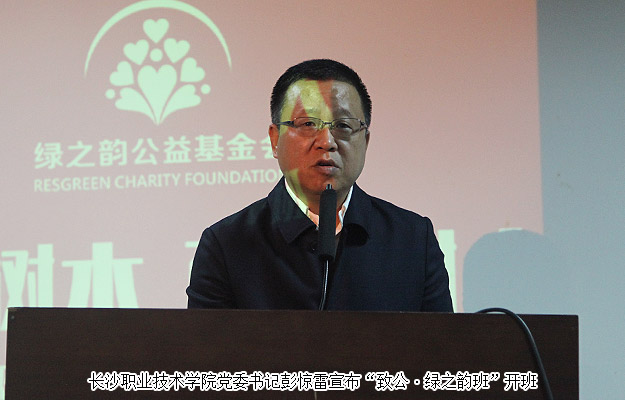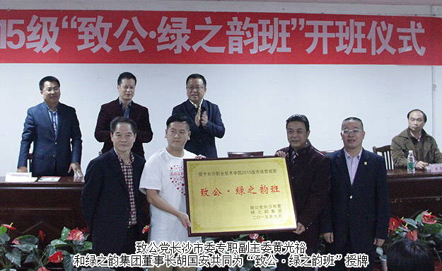2015年11月3日,由綠之韻集團(tuán)和致公黨長沙市委聯(lián)合開辦的“致公?綠之韻班”在長沙職業(yè)技術(shù)學(xué)院舉行了開班儀式。致公黨長沙市委專職副主委黃光裕、長沙市教育局副局長楊慶江、致公黨長沙市委秘書長梟燕等出席活動(dòng),綠之韻集團(tuán)董事長胡國安,綠之韻集團(tuán)辦公室主任、工會(huì)副主席馮紅,湖南省綠之韻公益基金會(huì)秘書長蔣文,綠之韻集團(tuán)團(tuán)委書記李倩婷,湖南分公司副經(jīng)理劉磊及愛心經(jīng)銷黃翔、李政沅、周書明等代表參加開班儀式。長沙職業(yè)技術(shù)學(xué)院黨委書記彭驚雷帶領(lǐng)學(xué)校領(lǐng)導(dǎo)班子成員和“致公?綠之韻班”50多名學(xué)生及部分教師代表參加活動(dòng)。