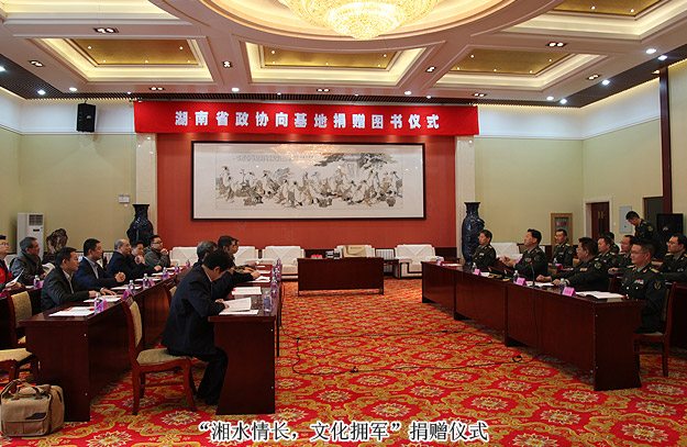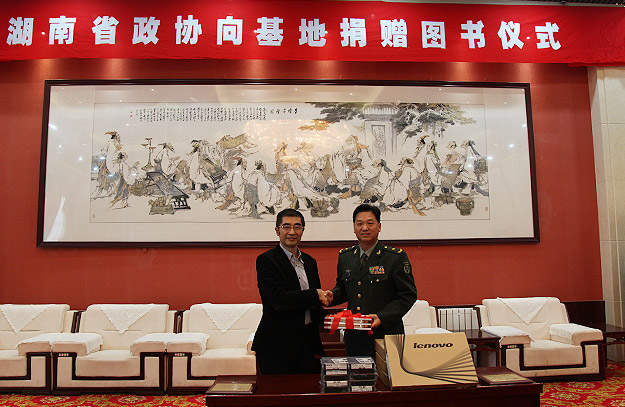 24日,“湘水情長”——湖南省政協(xié)委員文化擁軍活動捐贈儀式在酒泉衛(wèi)星發(fā)射基地東風(fēng)賓館舉行,湖南省政協(xié)副主席張大方代表省政協(xié)向基地負(fù)責(zé)同志贈送圖書(目錄)、筆記本電腦、電子書等,并向參加捐贈的委員單位頒發(fā)證書?;刎?fù)責(zé)同志致答謝詞,對湖南省政協(xié)的文化擁軍活動表示贊賞,并表示將推動湖南雙擁工作的開展。