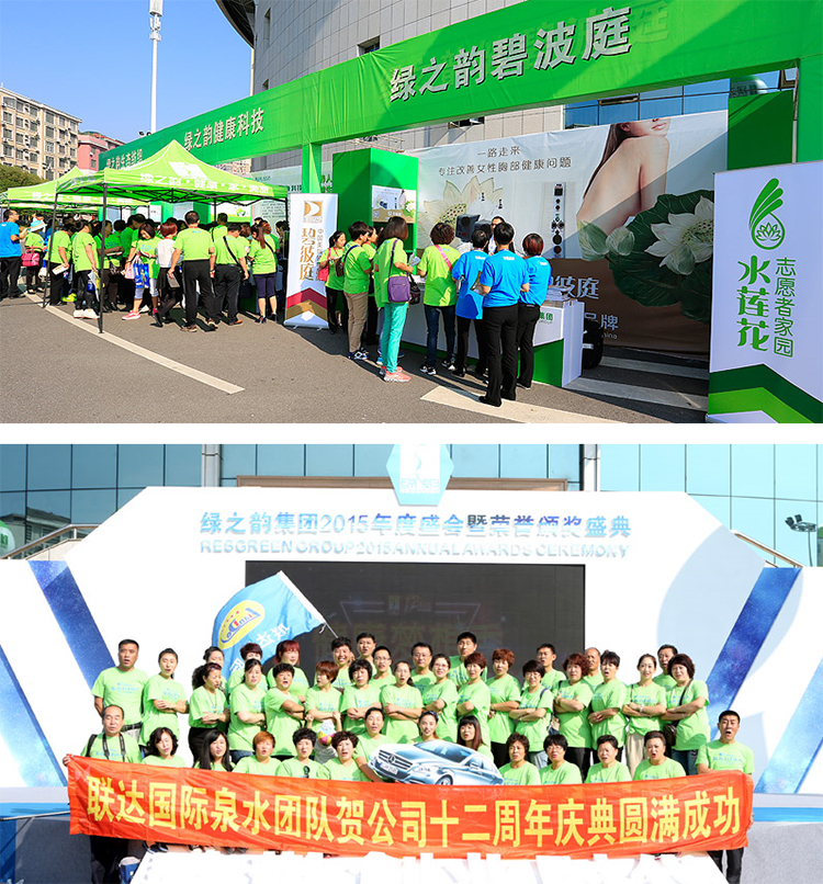 十二周年,十二大展區(qū):韻宜生、綠韻蘭茜和享居系列產(chǎn)品展區(qū),種植生產(chǎn)基地展示區(qū),企業(yè)文化與品牌展示區(qū),公益基金會(huì)慈善展示區(qū),星光大道榮譽(yù)展示區(qū),海內(nèi)外旅游展區(qū),綜合體驗(yàn)區(qū),媒體綜合采訪區(qū),產(chǎn)品促銷(xiāo)區(qū)等展區(qū)全方位、立體化充分彰顯出綠之韻集團(tuán)十二年健康夢(mèng)想,美輪美奐,令人目不暇接。來(lái)自全球的15000多名綠之韻家人共同參觀與感受到此次產(chǎn)品嘉年華的恢弘場(chǎng)景和非凡魅力!