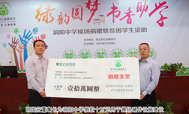 瀏陽市洞陽中學(xué)是綠之韻工業(yè)園希望小學(xué)的直升中學(xué),學(xué)校根據(jù)發(fā)展需要,決定更換原來的水泥操場為塑膠操場。當(dāng)?shù)弥獙W(xué)??嘤谫Y金困難,胡國安董事長代表綠之韻表示,將無償為學(xué)校捐建塑膠操場,為孩子們提供一個安全、舒適的運動環(huán)境,為學(xué)校全面提升辦學(xué)品位和全面實施素質(zhì)教育創(chuàng)設(shè)良好環(huán)境。捐贈儀式上,湖南綠之韻公益基金會理事長勞嘉發(fā)表致辭,她表示:少年強(qiáng)則國強(qiáng),青少年是祖國的未來,為學(xué)校捐建操場,為孩子們配備體育器材,給貧困學(xué)子給予經(jīng)濟(jì)資助,是綠之韻十二年來關(guān)注教育事業(yè)的舉措之一。綠之韻希望通過這份愛心激勵莘莘學(xué)子努力學(xué)習(xí),同時能夠起到拋磚引玉的作用,使社會更加重視知識和教育,關(guān)心人才的培養(yǎng)。她希望學(xué)子們在學(xué)習(xí)文化知識的同時加強(qiáng)體育鍛煉,要學(xué)習(xí)好、身體好、品德好,健康快樂地成長,將來做對國家有用的人。