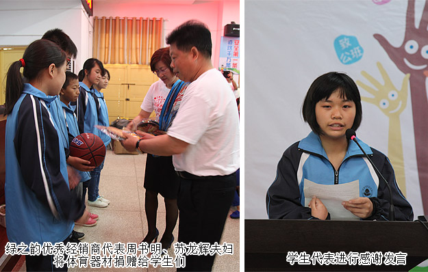 2015年5月28—29日,綠之韻“綠韻圓夢?書香助學(xué)”活動走進(jìn)瀏陽洞陽中學(xué)。為了改善青少年教育教學(xué)環(huán)境,共同關(guān)注孩子們健康成長,活動當(dāng)天,湖南省光彩事業(yè)促進(jìn)會副會長、長沙市光彩事業(yè)基金會理事長、綠之韻集團(tuán)董事長胡國安先生代表湖南綠之韻公益基金會向洞陽中學(xué)捐贈10萬元愛心款項用于該校愛心操場的建設(shè)。28日上午,湖南綠之韻公益基金會理事長、董事常務(wù)副總裁勞嘉女士與綠之韻優(yōu)秀經(jīng)銷商周書明、蘇龍輝夫婦一起走訪了學(xué)校貧困學(xué)子的家庭,并給予經(jīng)濟(jì)資助。29日,湖南綠之韻公益基金會又將一批體育器材親手送到了學(xué)生手中。綠之韻集團(tuán)黨總支部書記許達(dá)仲,湖南綠之韻公益基金執(zhí)行秘書長蔣文,綠之韻集團(tuán)辦公室主任馮紅,瀏陽經(jīng)濟(jì)開發(fā)區(qū)團(tuán)委副書記、綠之韻集團(tuán)團(tuán)支部書記李倩婷,湖南分公司業(yè)務(wù)經(jīng)理劉磊,帶領(lǐng)綠之韻黨團(tuán)成員以及近百位愛心經(jīng)銷商參與活動。