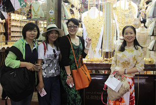 迪拜一度被譽為黃金城,當(dāng)?shù)氐狞S金亦一度因為金價低于鄰近中東各國而造成大量外流。綠之韻人徹底領(lǐng)略了一把什么叫真正的金碧輝煌。由于阿拉伯人對黃金情有獨鐘,所以這里的黃金首飾工藝也特別精致別致,是國內(nèi)完全沒法比的,各式夸張的珠寶金飾,你只有在電影里的國王和皇后身上才會看到。伙伴們鐘愛的黃金一起合影,更不忘把看中的心愛之物收入囊中。