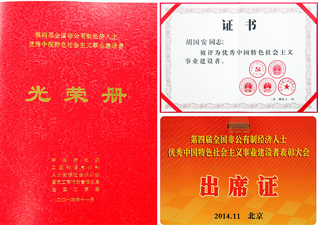 本次表彰大會由中央統(tǒng)戰(zhàn)部、工業(yè)和信息化部、人力資源和社會保障部、國家工商總局和全國工商聯(lián)共同舉辦。100名非公有制經(jīng)濟(jì)人士和其他新的社會階層人士受到表彰。自2003年創(chuàng)立綠之韻集團(tuán)以來,胡國安董事長堅(jiān)決擁護(hù)中國共產(chǎn)黨的領(lǐng)導(dǎo)和社會主義制度,擁護(hù)黨的路線、方針、政策,堅(jiān)定走中國特色社會主義道路,貫徹落實(shí)科學(xué)發(fā)展觀,企業(yè)管理制度完善、資質(zhì)質(zhì)量較高、財(cái)務(wù)狀況良好。黨、團(tuán)、工會組織健全并發(fā)揮了較好作用,做到愛國、敬業(yè)、誠信、守法、貢獻(xiàn),在本地區(qū)和同行業(yè)中起表率作用。同時(shí),在以下某些方面表現(xiàn)突出:一是積極履行社會責(zé)任、安全生產(chǎn)、節(jié)能減排、保護(hù)環(huán)境、關(guān)愛員工、誠實(shí)守信以及參與光彩事業(yè)和社會公益事業(yè),支持和服務(wù)抗擊自然災(zāi)害;二是積極創(chuàng)立自主品牌和自主知識產(chǎn)權(quán)、發(fā)明專利、新產(chǎn)品開發(fā)、新技術(shù)推廣等;三是在企業(yè)文化建設(shè)、遵守社會公德和職業(yè)道德、追求和實(shí)踐大健康文明的生活方式、社會影響、社會形象等方面有著突出表現(xiàn)。