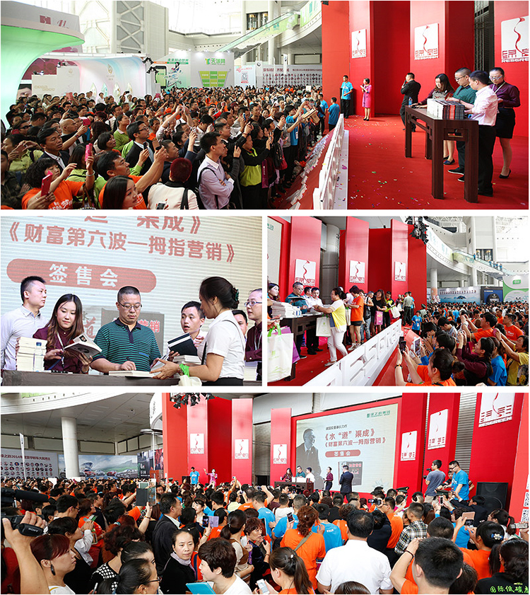 連續(xù)暢銷七年,首次發(fā)行百萬冊,《財(cái)富第六波—在家創(chuàng)業(yè)》被譽(yù)為作為一本影響中國人未來十年生活方式的創(chuàng)富圣經(jīng)一直影響深遠(yuǎn)。2013年胡國安董事長接連推出了《財(cái)富第六波—在家創(chuàng)業(yè)》的姊妹篇《財(cái)富第六波—拇指營銷》和解析中華水文化力作《水道渠成》,再次引爆市場。上午10:18,胡國安董事長親臨嘉年華現(xiàn)場簽售。新書簽售展區(qū)前,萬余名伙伴的到來讓現(xiàn)場排起了長龍,氣氛異?;鸨?,不到1個(gè)小時(shí)近5000冊《財(cái)富第六波—拇指營銷》和《水道渠成》就搶售一空。