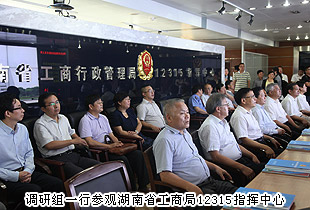 在湖南省工商局黨組書記、局長(zhǎng)李金冬的陪同下,調(diào)研組一行首先來(lái)到湖南省工商行政管理局12315指揮中心聽(tīng)取了關(guān)于湖南工商12315指揮系統(tǒng)的工作匯報(bào)。湖南工商12315指揮系統(tǒng)是工商機(jī)關(guān)受理消費(fèi)者申訴舉報(bào),調(diào)解消費(fèi)糾紛,查處侵權(quán)案件,加強(qiáng)市場(chǎng)監(jiān)督的維權(quán)熱線,分為大屏幕拼接顯示墻系統(tǒng)、LED顯示屏系統(tǒng)和可視調(diào)度指揮系統(tǒng)等三個(gè)子系統(tǒng)。采用高清晰數(shù)字顯示、多屏圖像處理、網(wǎng)絡(luò)技術(shù)等科技手段,為12315指揮調(diào)度提供了網(wǎng)絡(luò)監(jiān)控、信息共享、數(shù)據(jù)分析和業(yè)務(wù)保障的綜合平臺(tái)。湖南省政協(xié)主席陳求發(fā)指出,一定不斷加強(qiáng)和改進(jìn)消費(fèi)維權(quán)工作,不斷拓展維權(quán)功能,努力把12315打造成經(jīng)濟(jì)領(lǐng)域的“110”,化解矛盾的“接訪點(diǎn)”,消費(fèi)維權(quán)的“保護(hù)神”,工商形象的“展示窗”。