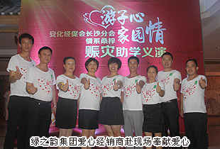 在接受湖南衛(wèi)視著名主持人王歡采訪時,胡國安董事長臉上溢滿凝重,眼中飽含熱淚,幾句簡單而樸實的話語幾乎感動了現(xiàn)場所有的人:“我在安化鄉(xiāng)音中啟蒙,伴著改革開放長大,無論身在何方,都無法割舍我對生我養(yǎng)我的家鄉(xiāng)安化的深深思念和無限牽掛。沒有安化,就沒有綠之韻;災害無情,游子有愛。作為一名安化大山深處走出來的企業(yè)家,更應關注家鄉(xiāng),情系家鄉(xiāng),建設家鄉(xiāng),回報家鄉(xiāng),主動承擔社會責任,用愛回報廣大桑梓。捐款只是一個開始,綠之韻集團將資助更多家鄉(xiāng)公益事業(yè),繼續(xù)關注安化災區(qū)重建,幫助災區(qū)的人民渡過難關、重建美好家園,幫助受災的莘莘學子早日重返校園!”