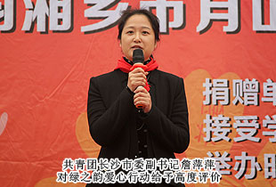 共青團長沙市委副書記詹萍萍指出:綠之韻集團作為共青團、青基會愛心理事單位,多年來以自己的實際行動承擔社會責任,值得尊敬和學習。傳承愛,發(fā)揚愛,未來我們將仍然緊密開展活動,給社會注入愛的力量。