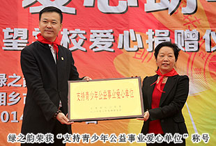 揭牌儀式上,月山鎮(zhèn)學校的學生們向出席儀式的綠之韻集團愛心人士敬獻了紅領(lǐng)巾。全球營銷中心(中國區(qū))副總經(jīng)理劉維利代表綠之韻慈善基金遞交30萬元愛心捐贈支票,長沙市青基會理事長羊舒麟接受捐贈,并授予綠之韻“支持青少年公益事業(yè)愛心單位”牌匾。共青團湘潭市委書記白云峰與綠之韻集團胡國安董事長共同為希望學校揭牌,并向胡國安董事長頒發(fā)了愛心企業(yè)家榮譽牌匾,各級領(lǐng)導嘉賓與愛心經(jīng)銷商代表全程見證。