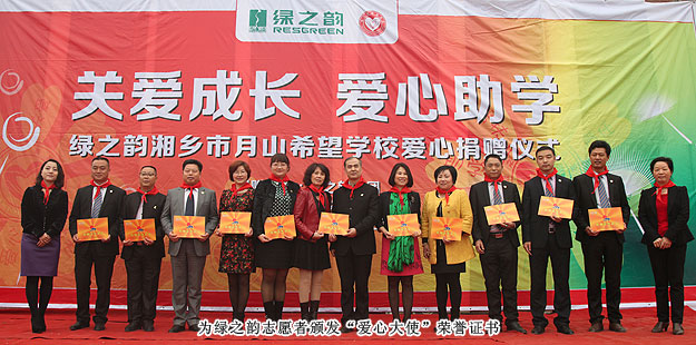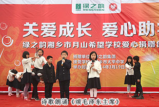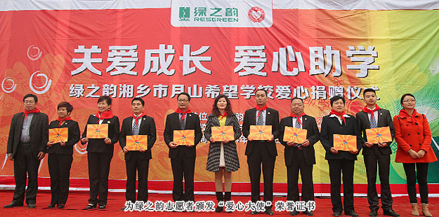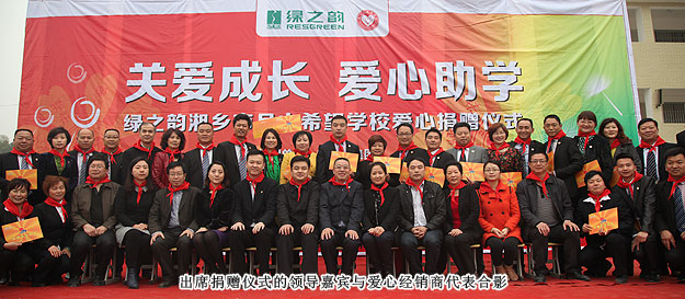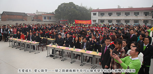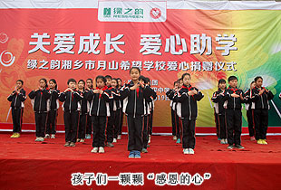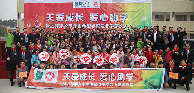2014年3月19日,由共青團長沙市委、長沙市青基會牽頭,綠之韻集團出資30萬元建設(shè)的第九所希望學?!熬G之韻湘鄉(xiāng)市月山鎮(zhèn)希望學校”在湖南湘鄉(xiāng)市揭牌成立。共青團湘潭市委書記白云峰、共青團長沙市委副書記詹萍萍、湘鄉(xiāng)市人大常委會黨組副書記、副主任王建湘、長沙市青基會理事長羊舒麟、月山鎮(zhèn)常務(wù)副鎮(zhèn)長徐慧湘等十幾位領(lǐng)導嘉賓出席,綠之韻集團董事長胡國安、全球營銷中心(中國區(qū))副總經(jīng)理劉維利、湖南分公司經(jīng)理張薇與200多位綠之韻愛心經(jīng)銷商共同為愛傳承,為孩子們送上如春天般的融融暖意。