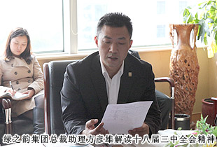 會上,綠之韻集團(tuán)總裁助理方彥雄組織全員學(xué)習(xí)了《中國共產(chǎn)黨第十八屆中央委員會第三次全體會議公報(bào)》原文,詳細(xì)介紹了十八屆三中全會召開的背景、時間、指導(dǎo)思想、總體目標(biāo)、重點(diǎn)任務(wù),進(jìn)一步明確了黨的十八屆三中全會是在我國改革開放新的重要關(guān)頭召開的一次重要會議,是全面深化改革的又一次總部署、總動員,具有重大而深遠(yuǎn)的影響。