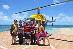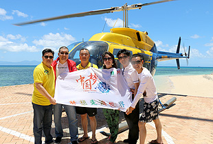 深藍(lán)的海水會(huì)讓人害怕,總覺得平靜的海水下面有很多可怕的生物。可是這種比淡藍(lán)深一點(diǎn),比深藍(lán)淺一點(diǎn)的海面,美得讓人都快窒息了。這么美得景色無法用語言來形容,只能靜靜感嘆大自然的魅力和神奇,不愧為世界八大奇跡之一。色彩絢麗的珊瑚和逾萬種獨(dú)特海洋物種構(gòu)成的海底奇景在直升機(jī)和潛水兩項(xiàng)活動(dòng)中感受得淋漓精致。在凱恩斯乘坐熱氣球、直升機(jī),在八百米的高空俯視晨曦中的大地,當(dāng)熱烈燦爛的朝霞映紅臉膛的剎那,心境也豁然放達(dá)開來。在2000多米高的云霧間飄乎游蕩,呼吸著沁人肺腑的涼氣,凌空俯瞰成群的袋鼠在叢林溪流中嬉戲跳躍。俯瞰大堡礁,美得如夢(mèng)如幻,這是一般人難以想象的體驗(yàn)。胡國安董事長與大家一起乘坐直升飛機(jī),綠之韻事業(yè)給每一位事業(yè)伙伴帶來“翱翔”的機(jī)會(huì)!綠之韻人的驚聲尖叫與縱情歡笑撒滿整個(gè)天空與海面,久久回蕩。
