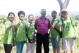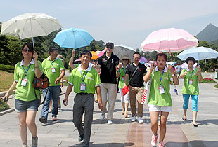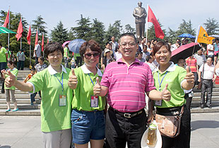 上午10時,綠之韻營銷精英2013韶山紅色之旅一行抵達了魂牽夢繞的美麗韶山。第一站,來到毛澤東銅像廣場,瞻仰偉大的毛主席。毛主席銅像立于高高的紅色花崗巖石基座上,背靠韶峰,主席身軀偉岸,手握書卷,雙眼炯炯有神,面帶微笑地注視著廣場,注視著遠方,仿佛在歡迎遠來的客人和世界各地的朋友,主席又似乎停步思考著天下的大事,一派學(xué)者風(fēng)范。胡國安董事長不畏炎熱,百忙之中驅(qū)車來到偉人故里,來到綠之韻伙伴們身邊,追憶往昔,敘說衷腸,暢享夢想,伙伴們興奮不已、激情四溢,整齊有序排好隊列和胡國安董事長一一合影留念。接著,在胡國安董事長的引領(lǐng)下,大家懷著無比崇敬的心情向毛主席的銅像獻花、敬禮,向毛主席三鞠躬,像全國各地奔向韶山?jīng)_的人們一樣,通過這種最傳統(tǒng)的方式來祝福、紀(jì)念、緬懷……站在巨大的塑像腳下,一種自豪而激動地情懷油然而生,綠之韻們伙伴們不禁讓我想起毛主席那豪邁飄逸的詩篇《沁園春?雪》:“數(shù)風(fēng)流人物,還看今朝”。