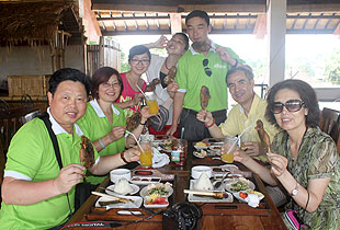 烏布皇宮是烏布王朝在16世紀(jì)所建造的皇宮,遺址內(nèi)雖已無(wú)國(guó)王居住,但據(jù)說(shuō)還有其皇族后裔深居其中,皇宮外觀雄偉的石刻技術(shù)堪稱一絕,內(nèi)部裝潢更是金碧輝煌令人贊嘆不已。在烏布,手工作坊和賣藝術(shù)品的小店隨處可見(jiàn),但來(lái)烏布最不能錯(cuò)過(guò)的還是烏布傳統(tǒng)市場(chǎng),這幾乎是每一位巴厘島觀光客旅行中不可錯(cuò)過(guò)的旅游地點(diǎn),綠之韻精英們?cè)缇湍θ琳?、躍躍欲試,蜂擁而上選購(gòu)自己心儀的手工藝品和商品。烏布傳統(tǒng)市場(chǎng)位于烏布市中心,烏布皇宮正對(duì)面,除了一排灰白的兩層式建筑,周圍的三條路上還聚集了各式的商店,這里是烏布的精華區(qū),人多嘈雜,各式貨品都有,例如銀器、木雕、編織、各式蔬果、衣服、沙龍、皮件、鞋子及紀(jì)念品、樂(lè)器等等。午餐時(shí),綠之韻精英們大飽口福,享用了印度尼西亞獨(dú)特的臟鴨餐,巴厘島的特色美食臟鴨餐是赫赫有名的特色餐品。當(dāng)?shù)鼐用癜养喿由B(yǎng)在稻田中,非常的生態(tài),由于鴨子靠吃食稻田里的小蟲為生,當(dāng)?shù)厝朔Q臟鴨。鴨肉鮮美,富有彈性,極少的脂肪,在當(dāng)?shù)靥赜械呐腼兗庸ず?,粘上特制醬料,大家紛紛感嘆美味夠勁道,真是聞名不如品嘗。